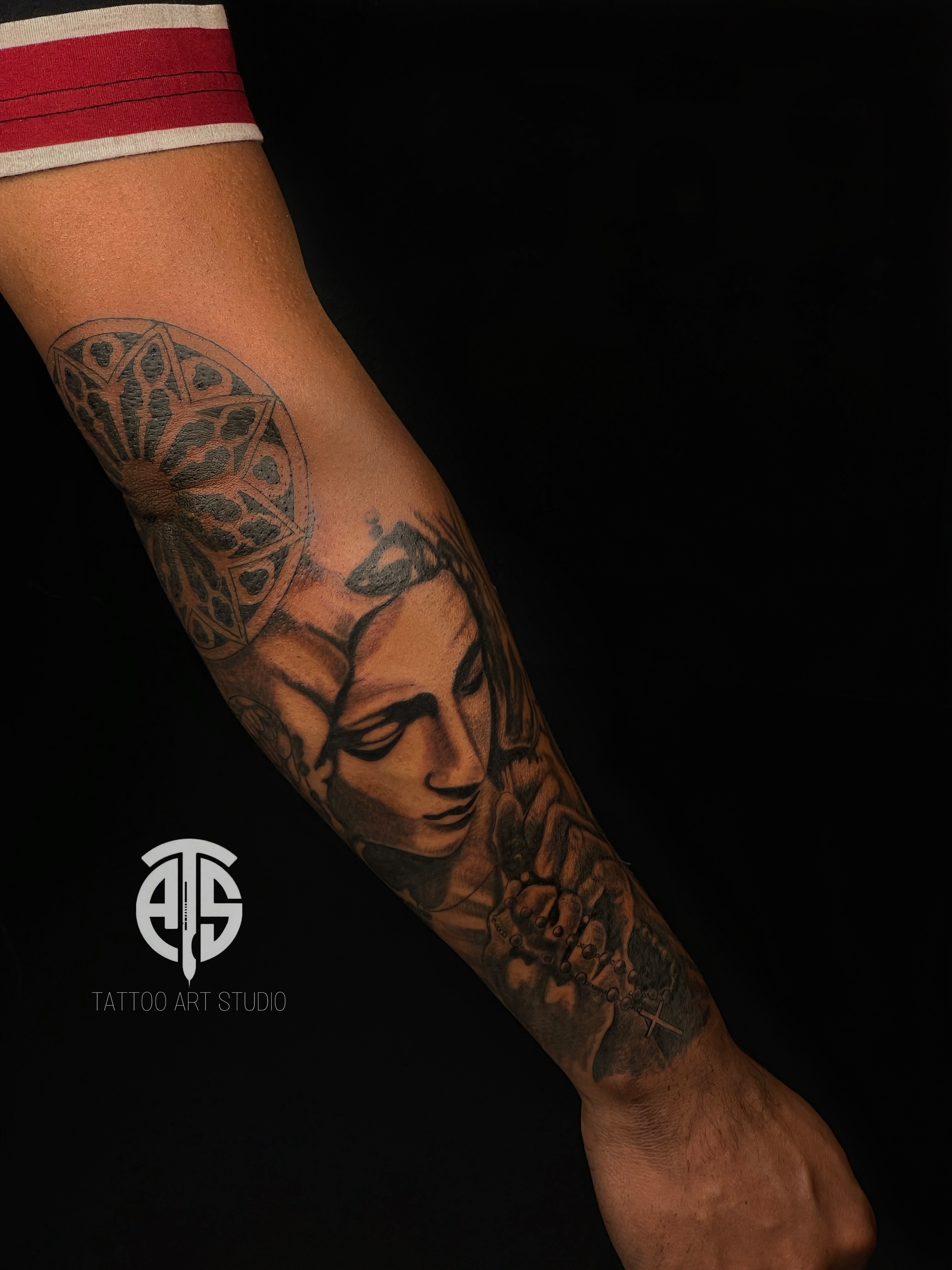 We draw sleeve tattoos which are large tattoos or collections of smaller tattoos that cover the whole arm.